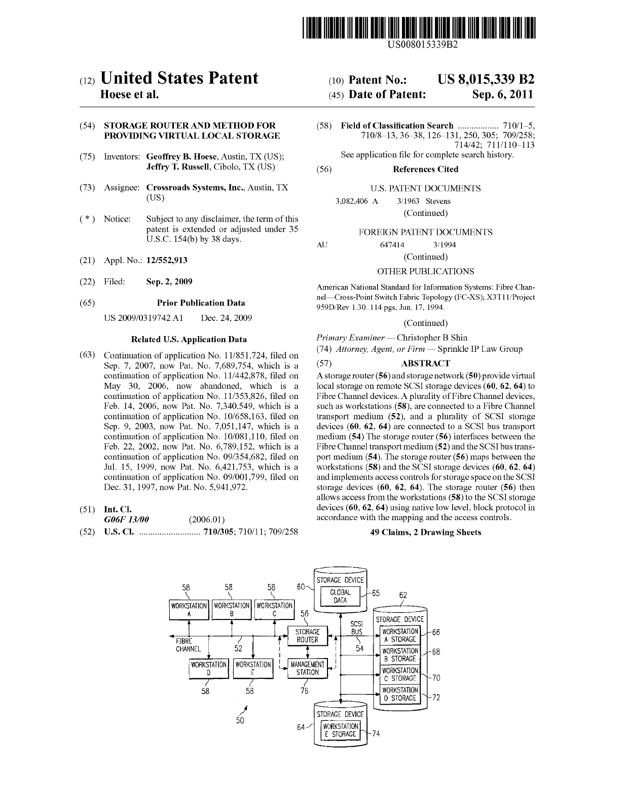 US 8,015,339 B2 1 STORAGE ROUTER AND METHOD FOR PROVIDING VIRTUAL LOCAL STORAGE TECHNICAL FIELD OF THE INVENTION This application is a continuation of